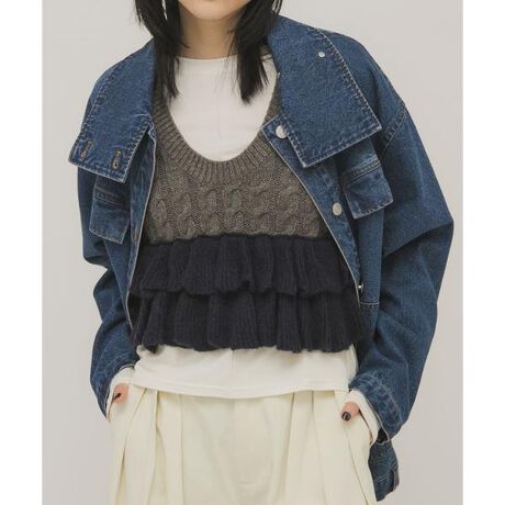 裾の配色フリルが特徴的なニットベスト。前後2WAYの着用が可能になっており、着ていただくと自然と華やかさをプラスします。さりげなくケーブル編みになったところもポイント。コンパクトなサイズ感なのでメルカリのある着こなしも期待できます。