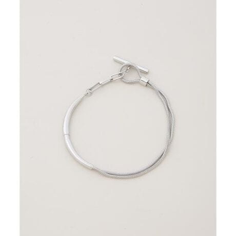 フロント部分にエッジを効かせた筒形パーツを配したモードなブレスレット。手首に沿ってパーツとチェーンが切り替わるディテールが、動きに合わせて繊細に輝く一品です。