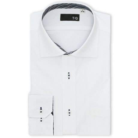 表面感のあるドビーの織り柄(ヘリンボンストライプ)です。衿型は衿開きが大きく、ネクタイとのバランスが取りやすいワイドカラーを採用しています。台衿・カフス裏の別生地がアクセントになっています。