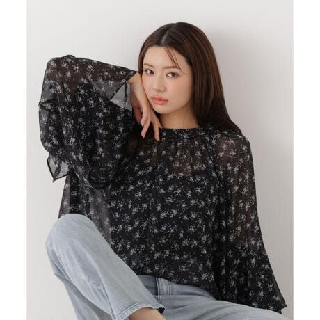 小花柄プリントを施した楊柳ジョーゼット素材のブラウス。2段のボリュームスリーブが華やかさを演出します。裾は後ろが長くなったフィッシュテールデザインで、アウトスタイルが様になる1枚。裏地がないので軽やかな印象に見せてくれます。お持ちのインナー合わせがおすすめです。