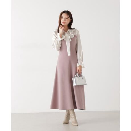 春らしいストライプ柄が映える、ブラウスレイヤード風のニットドッキングワンピース。ニット素材で動きやすくなっています。手首を締めるスリーブラインがフェミニンな印象。ラッフルとタイを組み合わせた女性らしいディテールは、アウターを羽織ってもフロントデザインがコーディネートの主役になります。