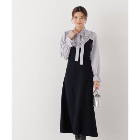 春らしいストライプ柄が映える、ブラウスレイヤード風のニットドッキングワンピース。ニット素材で動きやすくなっています。手首を締めるスリーブラインがフェミニンな印象。ラッフルとタイを組み合わせた女性らしいディテールは、アウターを羽織ってもフロントデザインがコーディネートの主役になります。