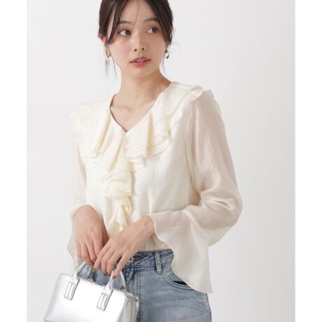 カジュアル見えする程よいシアー感が新鮮な楊柳生地のブラウス。トレンドの大きめラッフルディテールがポイントで、アウターを羽織ってもフロントデザインが映えます。緩やかに広がるセミフレアスリーブも女性らしく、大人な印象を演出してくれます。