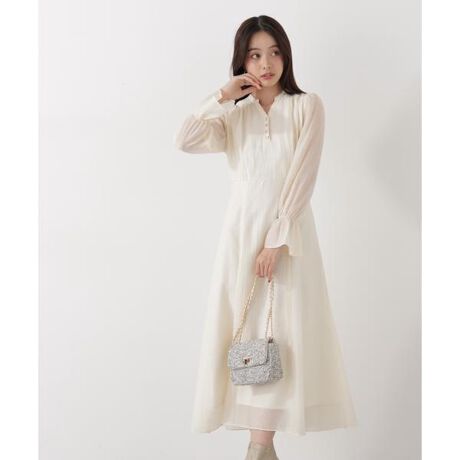 楊柳加工した程よくシアーな素材を使用したワンピース。広がりすぎないレディなラインに、後ろウエストはレースアップでシルエット調整が可能。手首をきゅっと締めるスリーブラインがフェミニンな印象をプラス。フロントのゴールドカラー釦もポイントです。