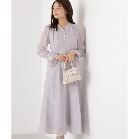 楊柳加工した程よくシアーな素材を使用したワンピース。広がりすぎないレディなラインに、後ろウエストはレースアップでシルエット調整が可能。手首をきゅっと締めるスリーブラインがフェミニンな印象をプラス。フロントのゴールドカラー釦もポイントです。