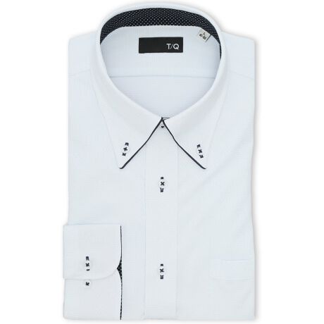 表面感のあるドビーの織り柄(刺し子調)です。衿型はアンタイド(ノーネクタイ)でも衿立ちよく収まり、オフィスカジュアルにもぴったりなボタンダウンを採用しています。衿先のパイピングと台衿・カフス裏の別生地がアクセントになっています。