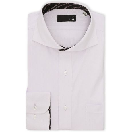 表面感のあるドビーの織り柄(ヘリンボンストライプ)です。衿型はノータイでのオフィスカジュアルに最適なカッタウェイを採用。剣先が外に大きく開いていて、衿が目立たずスッキリとした印象です。台衿・カフス裏の別生地がアクセントになっています。