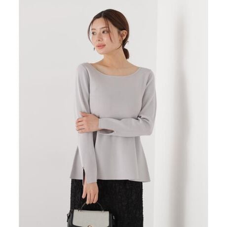 フレアペプラムで女性らしいシルエットを叶えるニット。上品なデコルテラインと、袖口のスリット&キラ釦がアクセントになっています。シンプルながらもおしゃれで、幅広いシーンに活躍してくれます。