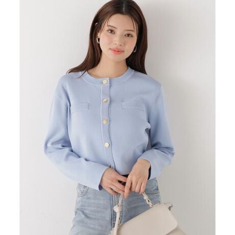 オンオフ問わずに着回せるニットカーディガン。羽織りにも前ボタンを留めてプルオーバー風にも着こなせます。大きなメタルボタンがポイント。同素材のシアーペプラムリブニットとのアンサンブルもお勧めです。