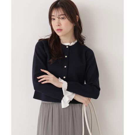トレンド感のある異素材ドッキングを取り入れたカーディガン。襟ぐりと袖口にシャツ生地をドッキングし、一枚でコーディネートが完成します。さらっとした肌触りのニットで、春先まで活躍。スカートもパンツも合う短丈シルエットで、スタイルアップが叶います。