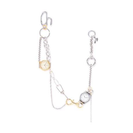 チェーンの端材や廃棄の金具、文字盤のない時計などアトリエ内で眠っていた廃材を用いて制作したユニークピースのネックレス兼パンツチェーン。複数のマテリアルを使用することで躍動感のあるデザインに仕上げています。
