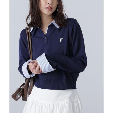 ご好評いただいているポロニットに長袖が登場!グレーとネイビーは人気色、秋らしいブラウンはブルーチェックの襟とカフスを付けた新色です。綿タッチのニットポロにシャツをレイヤードしたようなドッキングデザイントップス。トレンドのレイヤードスタイリングが1枚着るだけで完成します。左胸にはブランドロゴの頭文字を取った「F」刺しゅう入りでプレッピーな雰囲気に。ミニスカート合わせでヘルシーなプレッピースタイリングが今年らしくておすすめ。袖はたくし上げたり、カフスは伸ばしたままでも折り返しても着ていただけます。※モデルの着用画像の場合、光の当たり具合により、実際の色味と異なって見えることがございます。色味は、商品単体の画像をご参照ください。