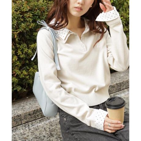 ご好評いただいているポロニットに長袖が登場!グレーとネイビーは人気色、秋らしいブラウンはブルーチェックの襟とカフスを付けた新色です。綿タッチのニットポロにシャツをレイヤードしたようなドッキングデザイントップス。トレンドのレイヤードスタイリングが1枚着るだけで完成します。左胸にはブランドロゴの頭文字を取った「F」刺しゅう入りでプレッピーな雰囲気に。ミニスカート合わせでヘルシーなプレッピースタイリングが今年らしくておすすめ。袖はたくし上げたり、カフスは伸ばしたままでも折り返しても着ていただけます。※モデルの着用画像の場合、光の当たり具合により、実際の色味と異なって見えることがございます。色味は、商品単体の画像をご参照ください。
