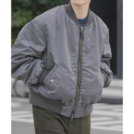 ピグメント染めを施し、長年着込んだような深みのある色落ちと、縫い目に現れる自然なアタリ感を表現。新品でありながら、こなれた表情を纏い、シンプルなスタイリングにもほどよい存在感を添えてくれる一着です。ミリタリーの定番シルエットを、ゆったりとした身幅と太めのアームホールで現代的にアップデート。ドロップショルダーが無骨さの中に程よい抜け感を生み、厚手のスウェットやパーカーの上からもストレスなく羽織れます。重厚感のあるフロントファスナーやフラップ付きポケットなど、MA-1らしい機能美はそのままに。ヴィンテージ感と都会的な洗練を併せ持つ、スタイリングの主役になるミリタリーブルゾンです。