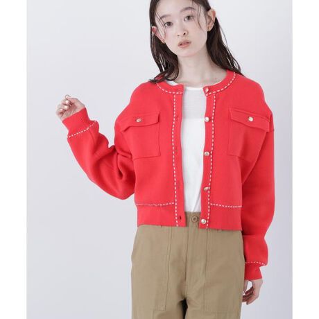 上品さとカジュアルさを兼ね備えたニットジャケット。存在感のある太めの配色ステッチがアクセントとなり、着こなしにメリハリをプラス。フロントのゴールドカラー釦が華やかで女性らしい印象です。ニットならではの柔らかな着心地で、軽いアウターとしてもカーディガン感覚でも活躍してくれます。<素材>膨らみのあるダブルジャガード編みです。<詳細>仕様・前ボタン裏地・なし透け感・なし / 光沢・なし / 伸縮性・あり生地の厚さ・普通※モデルの着用画像の場合、光の当たり具合により、実際の色味と異なって見えることがございます。色味は、商品単体の画像をご参照ください。