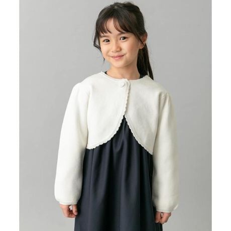 入学式など特別な日からデイリーまで多様なシーンに使えるニットカーディガンをお作りしました。ボトムスやワンピースを選ばず着れるボレロ丈で、手持ちのアイテムとも組み合わせしやすく別売りのスカラーレース襟ワンピースとも相性抜群。フロントにはさりげない同色のくるみ釦と、裾はスカラップのようなぽこぽこした丸みのある編みで上品な印象に仕上げました。色合いはフォーマルに着れるOFFとNAVYの2色展開でご用意しました。
