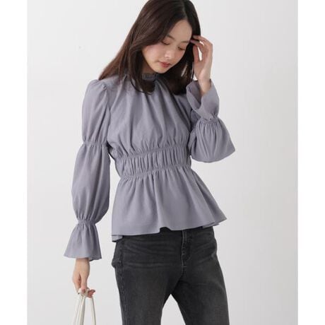 程よいウエストマークでスタイルアップが叶うブラウス。袖に入れたシャーリングがさり気ないアクセントとなり、お洒落な印象に見せてくれます。表情のある楊柳生地を使用しており、繊細な女性らしさとデイリーに使いやすいデザインを両立したカジュアルアイテムです。