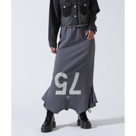 スウェット生地でラフに穿ける、リメイク風プリントスカート。