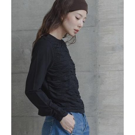 ボディー部分だけでなく袖口にもシャーリングを施し、シンプルながらもさりげなくニュアンスの出る一枚に仕上げました。