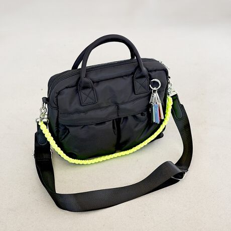 ネオンカラーのコードハンドルと、cheekのリボンチャームがアクセントとなり、シンプルながらも程よくトレンド感とエッジを効かせたデザインバッグ。