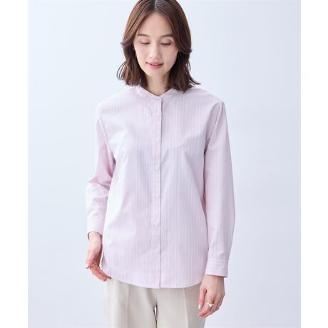 [型番:353833]清潔感と軽やかさをまとう毎日にちょうどいいストライプシャツすっきりとしたバンドカラーが首元を上品に見せるストライプシャツ。適度なゆとりと落ち感のあるシルエットで、オンオフ問わず着られる多彩なアイテムです。デニムで大人カジュアルに、スラックスで上品にと幅広いコーデに活躍。羽織りとしても使える万能性で、季節の変わり目にも重宝します。