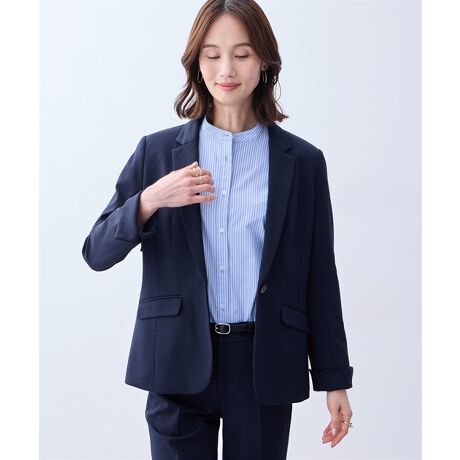 [型番:355610]美しいシルエットと快適さを両立するテーラードジャケット端正な表情のテーラードデザインに、動きやすさを兼ね備えた美モーションシリーズのジャケット。ほどよいストレッチ性があり、長時間の着用でも快適に過ごせるのが魅力。シンプルで合わせやすく、通勤スタイルからきれいめカジュアルまで幅広く対応。パンツにもスカートにも馴染む万能アウターで、1枚あると重宝します。