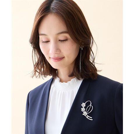 繊細なリボンモチーフに、パール調とビジューをあしらった上品なブローチ。