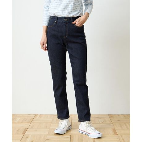 [型番:494661]ほどよく細身のシルエットで、脚をすっきりと長く見せるデニムスリムパンツ。柔らかく馴染むデニム素材でストレスのない穿き心地を叶えつつ、上品な濃色加工が大人の装いにマッチします。後ろウエストはゴム仕様で快適さもキープし、デイリーに活躍する万能アイテム。ニットやシャツを合わせるだけでバランスよく決まり、カジュアルにもきれいめにも着回し自在です。ジャケットと合わせれば、きれいめカジュアルなスタイリングにも対応。