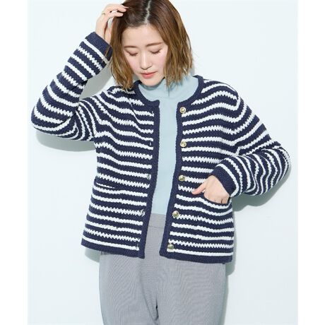 [型番:522420]着映えするボーダー柄をもっと軽やかに表情のある編地で仕上げたボーダー柄が、シンプルな装いにほどよい華やぎを添えるカーディガン。軽やかな着心地で季節の変わり目にも使いやすく、コンパクトな丈感がボトムを選ばずバランスよく決まります。デニムでカジュアルに、スカートで上品にと幅広い着こなしに対応する大人カジュアルの万能アイテムです。