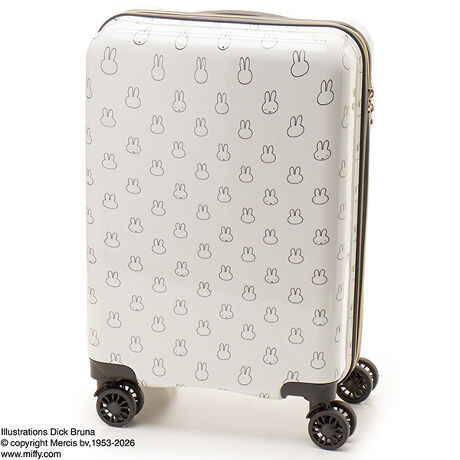 ミッフィーの可愛いお顔がたくさん!ミッフィーのメニーフェイス総柄のジッパー式スーツケースです。内装の生地もミッフィーのお顔の総柄です。本体表面は軽くて丈夫なPC(ポリカーボネート)とABS樹脂を採用し、割れにくく頑丈なボディーで大切なお荷物を守ります。キャスターは安定した走行性を発揮する双輪キャスター。内装は片側がジッパーで閉じられる前面間仕切り仕様、もう片側にはクロスベルトが付いており荷崩れを防いで収納することが可能です。また内装のジッパートップはミッフィーの形をしており、細部までこだわっています。