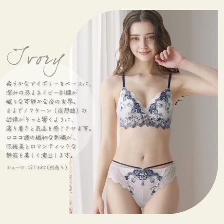 大人っぽさを感じさせるロココ調のチュールレースがストレッチレースの上に重なり、さらにアンダー部分だけに施したチュールレースのフリルが華やかで豪華なデザイン。