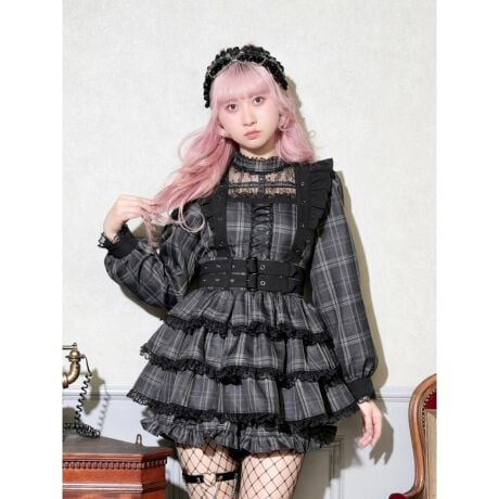 チェック柄にハーネス風ディテールを重ねゴシックムードを引き立てたセットアップ。