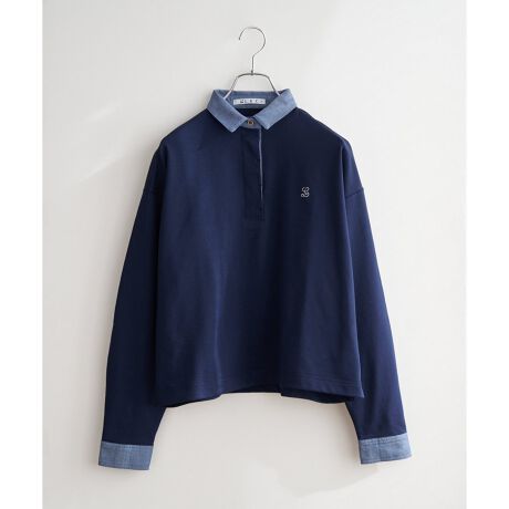 カットソー素材とシャンブレー布帛を組み合わせた、異素材デザインのラガープルオーバー。