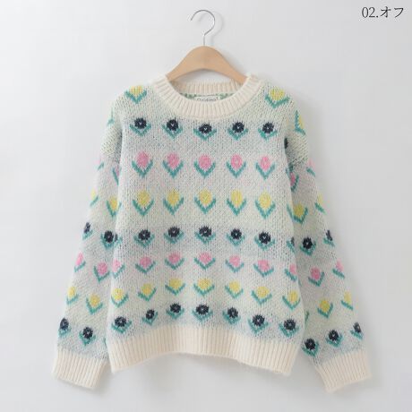 カラフルなお花が並んだ、大人可愛いニットプルオーバー。