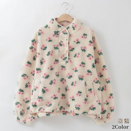 花柄を散りばめたボア素材が印象的な着こなしを演出するプルオーバー。