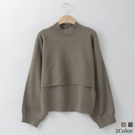 レイヤード風デザインがコーディネートに奥行きを与えるハイネックニットトップス。