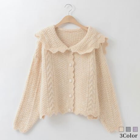 肩までかかるビッグカラーが愛らしいニットカーディガン。