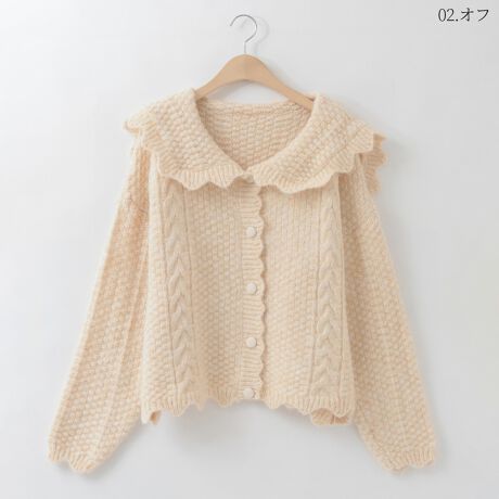 肩までかかるビッグカラーが愛らしいニットカーディガン。