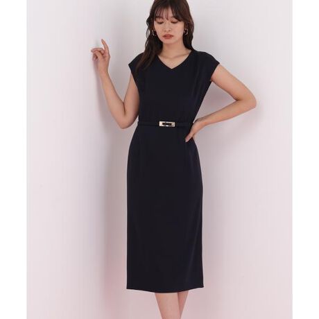 すっきりとしたVネックに上品な共地ベルトが付いたエレガントなワンピース。程良く身体に沿ったシルエットは女性の身体を美しく見せ、オケージョンにもデイリーにも使いやすいドレスになっています。肩が隠れる丈で腕を細く見せるカッティングが特長です。同素材のジャケットと合わせスーツやお仕事着、普段のキレイ目なシーンでのワンピースとして幅広く活躍するひざ下ワンピースです。