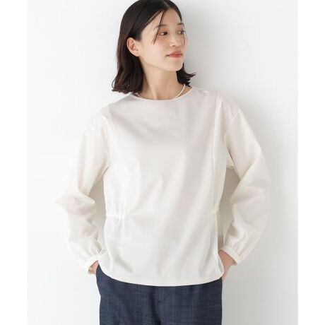 キレイ目ポンチとシャンブレー布帛をドッキングしたデザイントップスです。ワントーン微配色の色展開が春らしい一枚です。布帛部分は、ゴムドロストでギャザーが寄っていてスタイルUP効果があります。