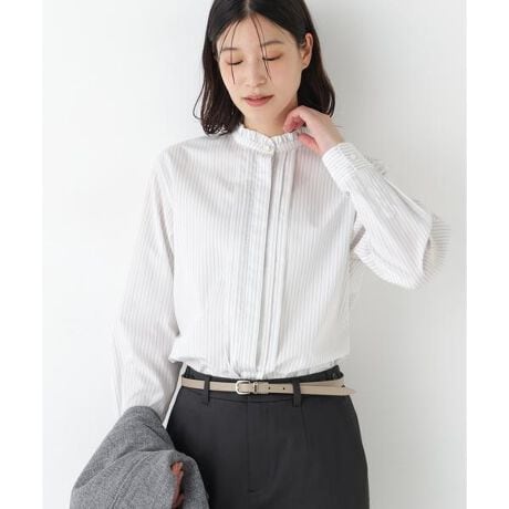 第襟の上にフリルのついた襟のスタンドフリルブラウスの前身頃にタックをプラスしたブラウスです。裾は前後差とスリットありで前裾は角を丸くとって女性らしいシルエットです。