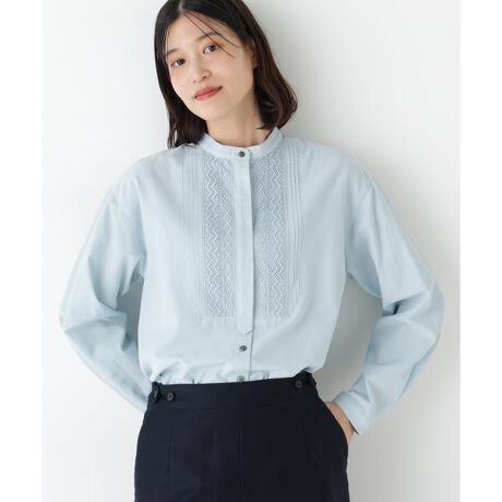 ビブヨーク部分に接ぎ合わせた太さの違う繊細なトーションレースとピンタックをあしらったボックス型のバンドカラーブラウスです。全開きですが上側は比翼あきなのでプルオーバー見えにもスタイリングしていただけます。