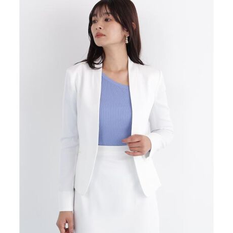 トリアセ混で、上品なハリ感のある素材を使ったジャケットです。ノーカラー、ノーボタンのコンパクトな作りで、シャープな印象。無駄なデザインをそぎ落とし、すっきりとしたシルエットにこだわった、PINKY&DIANNE定番のジャケットです。今期は前を閉めると前身頃が少しだけ重なるデザインで、開けたときにゴールドのホックがアクセントになるようアップデートしています。