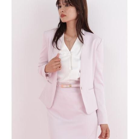 トリアセ混で、上品なハリ感のある素材を使ったジャケットです。ノーカラー、ノーボタンのコンパクトな作りで、シャープな印象。無駄なデザインをそぎ落とし、すっきりとしたシルエットにこだわった、PINKY&DIANNE定番のジャケットです。今期は前を閉めると前身頃が少しだけ重なるデザインで、開けたときにゴールドのホックがアクセントになるようアップデートしています。