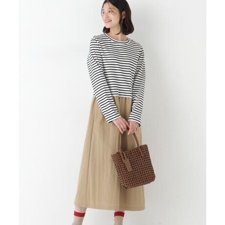 ハイゲージで編んだキレイな目面の引き揃え天竺を使用しています。スカートにはナチュラルなシボ感のあるニュアンスあるコットンナイロンタイプライターを使用しています。ブラックボーダー×ベージュ、ブルー×ネイビーの2色展開です。
