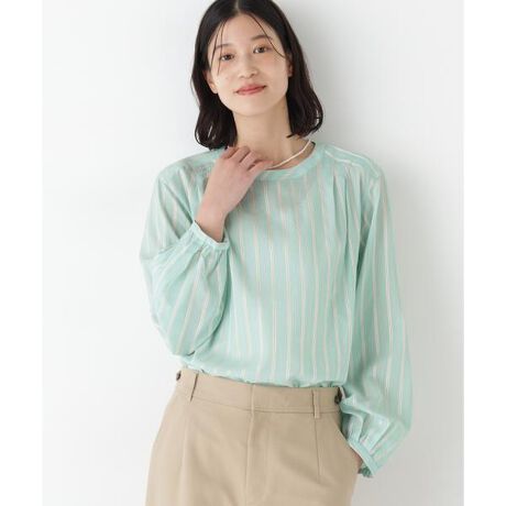 クルーネックながらストライプの見え方で華やかに仕上げたデザインブラウスです。襟は柄をバイアスにしています。やや長め丈ですが裾にスリットをいれることで軽やかな印象に仕上げました。