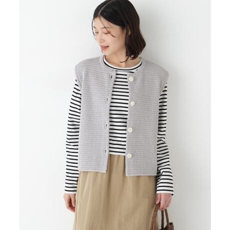 地柄がポイントの前開きベストです。トレンド感のあるショート丈が今季らしいバランスになっています。ボックスシルエットでスタイリングの幅が広がります。