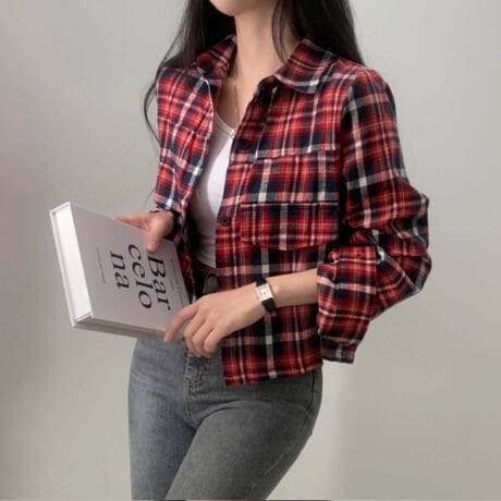 -韓国っぽく仕上がるクロップド丈チェックシャツ