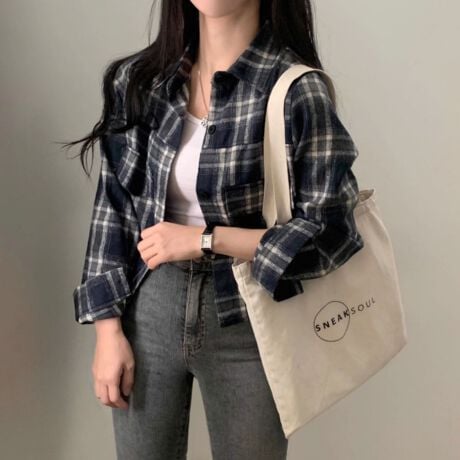 -韓国っぽく仕上がるクロップド丈チェックシャツ
