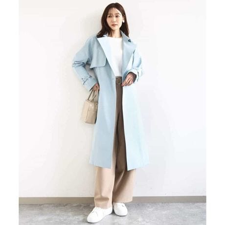ロングの着丈ながらも軽さがあるので、さっと羽織りやすいのが嬉しい。一般的なトレンチコートよりも堅苦しくなくカジュアルにも着こなしやすいデザインはコーディネートも選びません。ベージュ、ネイビーの定番色はもちろん、コーディネートに映えるクリアなライトブルーも今年らしい印象に。